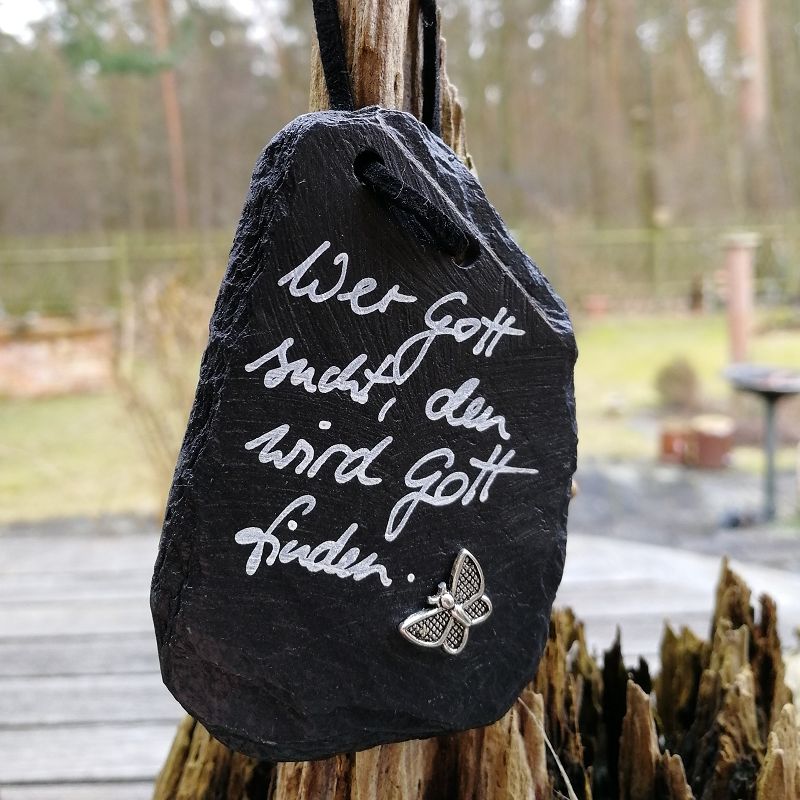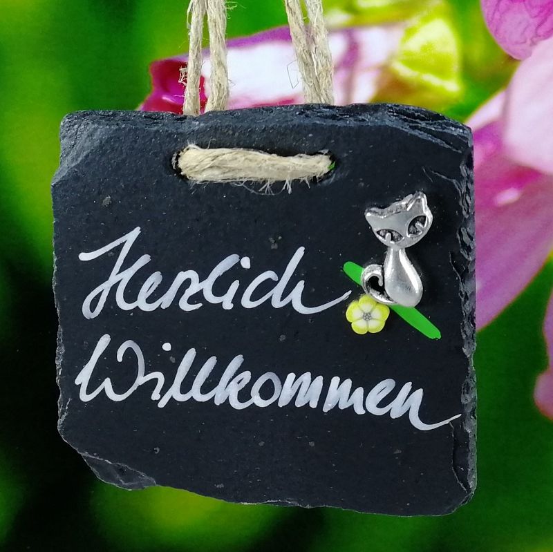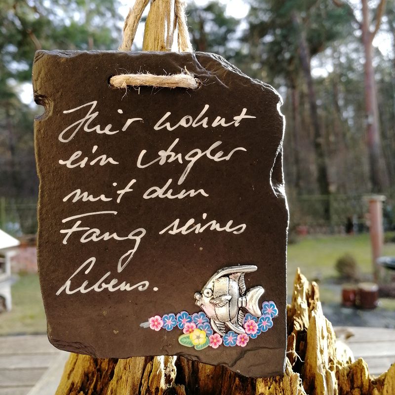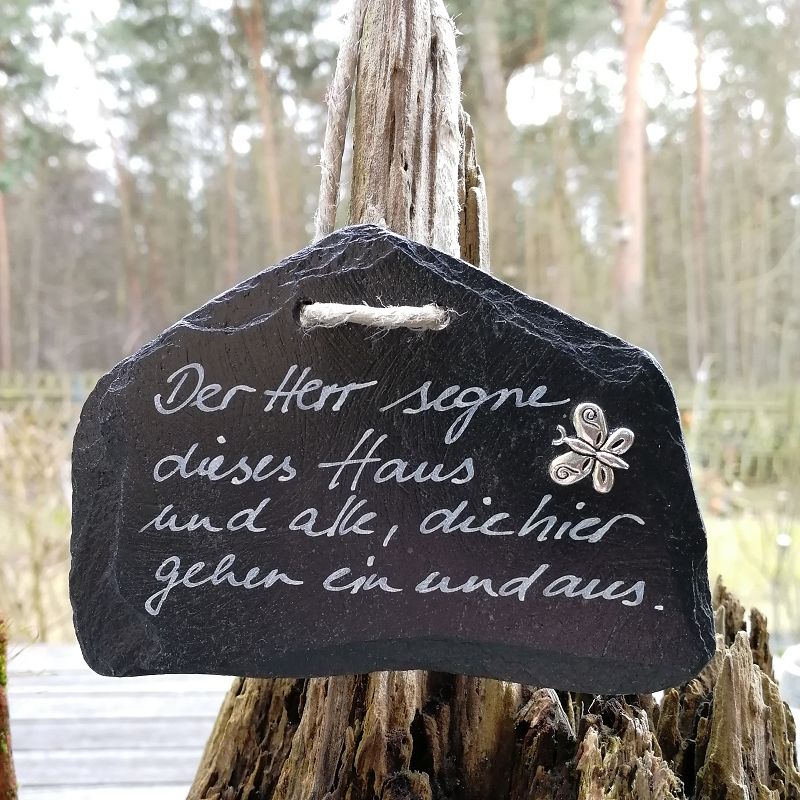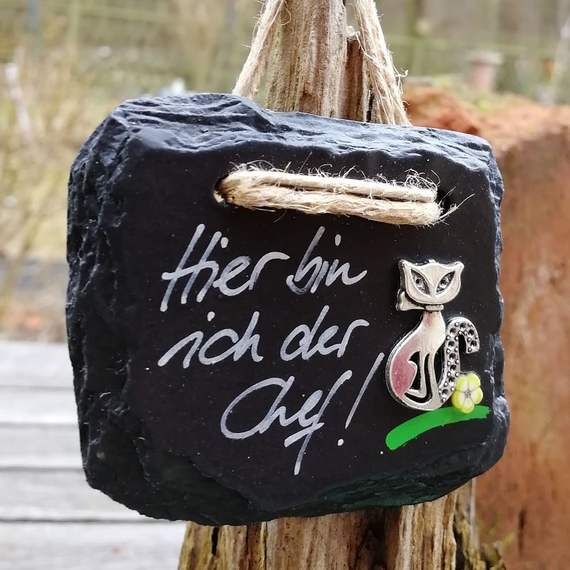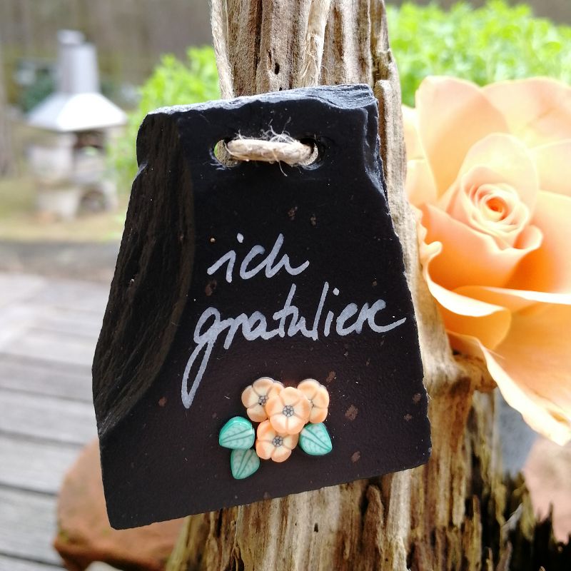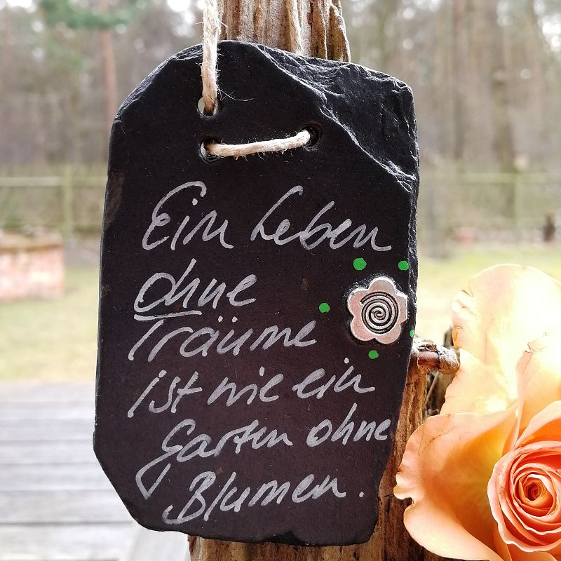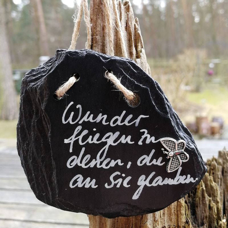 Ich fertige Geschenkanhänger aus Schiefer, Aufhänger, wetterfeste Kräuter- und Pflanzenschilder aus Schiefer, Blumentopfstecker mit persönlichen Botschaften, individuelle Schildchen, Gastgeschenke, Zitate und Sprüche auf Schiefer, Lustiges, Trauriges, Nachdenkliches, Mut machendes, zu vielen Themen und Anlässen das ideale kleine Mitbringsel oder auch Schiefergeschenk an sich selbst.